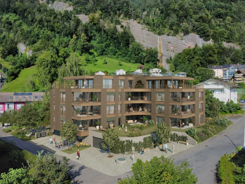 Mit Felice entsteht in Vitznau ein Zuhause, das Modernität und Natur harmonisch vereint. Elf Eigentumswohnungen – acht mit 4 ½ Zimmern und drei mit 3 ½ Zimmern – überzeugen durch grosszügige Grundrisse sowie eine sorgfältig geplante und hochwertige Ausstattung. Ein besonderes Highlight bilden die beiden Attikawohnungen mit grosszügigen, teilweise begrünten Terrassen, dekorativem Zierbecken, viel Privatsphäre und unvergleichlicher Aussicht. Kurz: ein exklusiver Rückzugsort mit höchstem Wohnkomfort. Ein Gewerberaum im Untergeschoss ergänzt das Projekt und eröffnet vielfältige Nutzungsmöglichkeiten (z.B. Büro, Praxis oder Atelier). Zur Anlage gehören zudem eine Einstellhalle für Autos, Velos und Motorräder sowie grosszügige Keller- und Nebenräume. Zwei separat zu erwerbende Disponibel-Räume erweitern das Angebot zusätzlich. Die hochwertige Fassade mit vertikaler Holzschalung und Metallelementen in warmen Bronzetönen fügt sich harmonisch in die natürliche Umgebung ein.